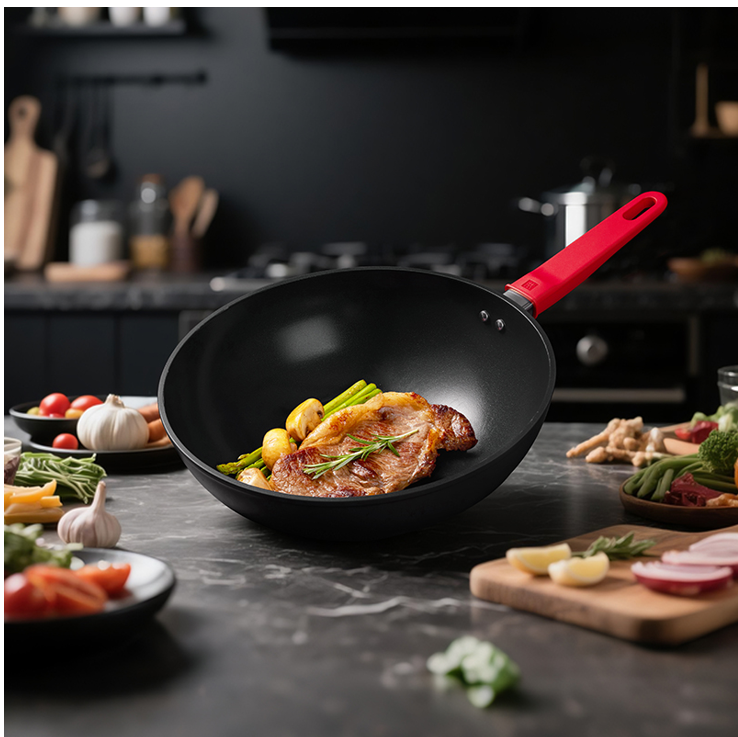 有鈦陶瓷覆面,國標1級不粘食品接觸級不粘內壁,入口健康安全3層加固內壁,更耐翻炒16倍耐磨外壁,不怕灶腳磨損3大專利手柄,防燙、防松動、顛炒安全