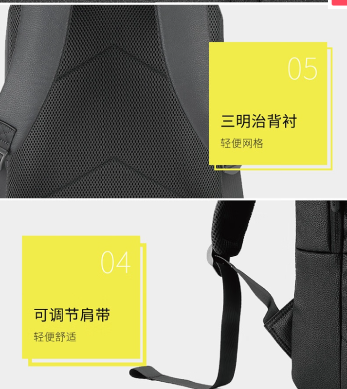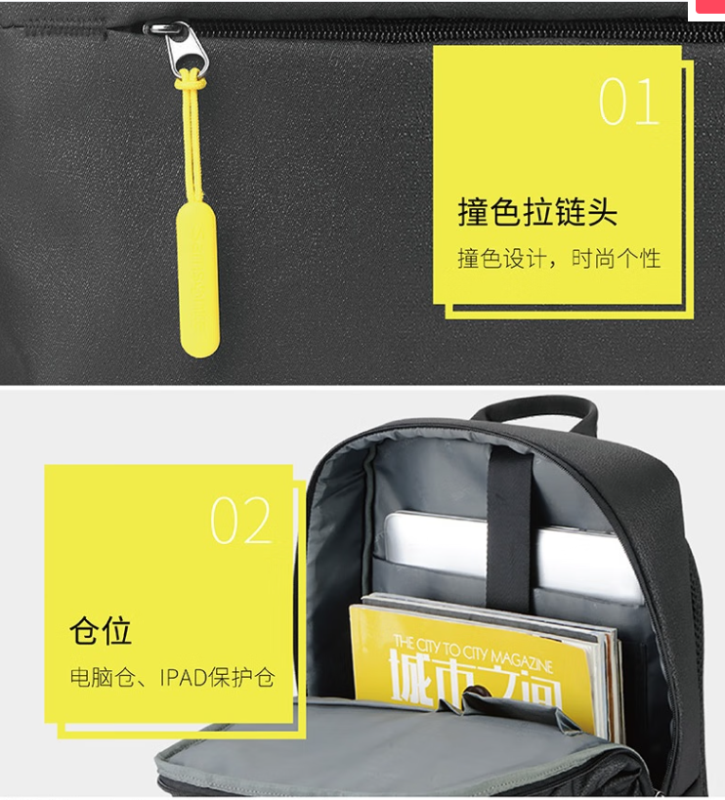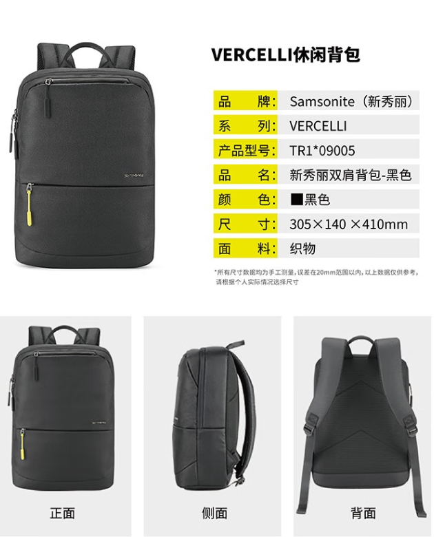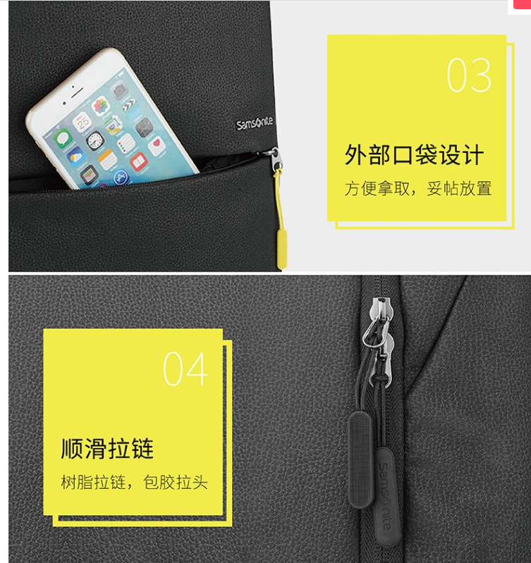 新秀麗包 . 主隔層設計容量大,直通底部大隔層2. 前隔層方便拿取小東西3. 三明治背襯,舒適、輕便、透氣4. 加棉肩帶,更加舒適,減少對肩部的壓迫