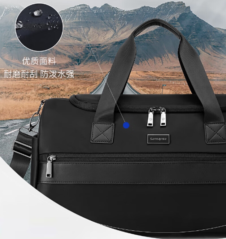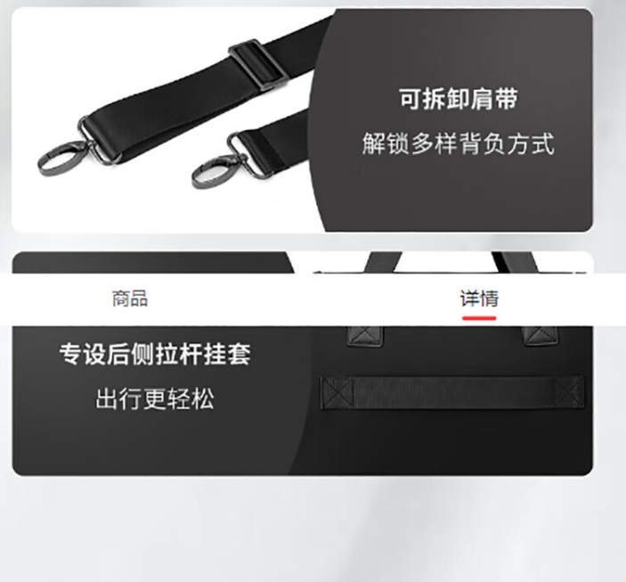 產品材質 :織物+合成革產品尺寸 :475210260mm精選290T細斜紋尼龍料,耐磨耐刮,防潑水強; 主袋:大開口生活倉 前幅拉鏈袋,高端合成革拼,方便存取,可放置手機、充電寶等物件;