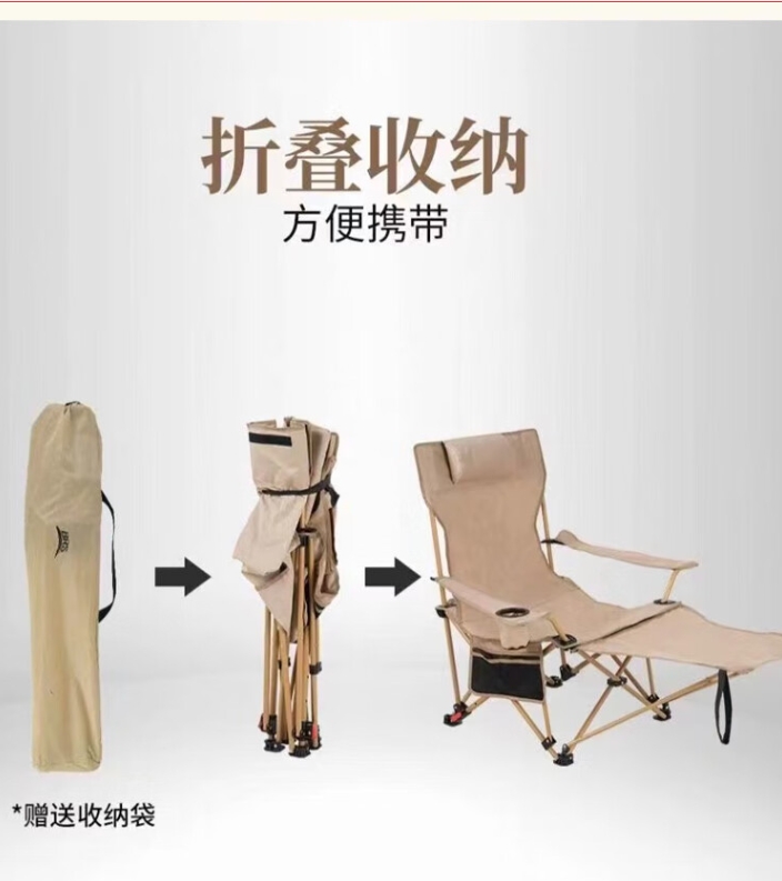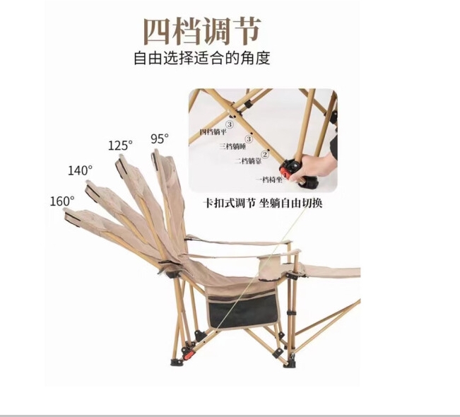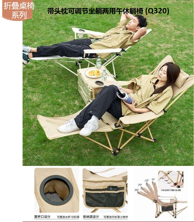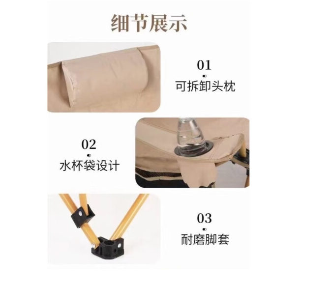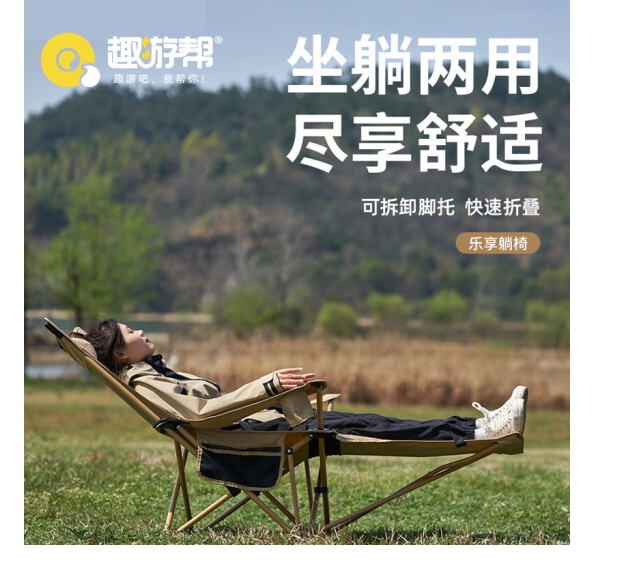 趣游幫1、坐躺兩用,四擋調節,隨心切換角度; 2、便捷置杯口,側邊置物袋,拿取更方便;3、快速折疊,即收即走;4、可拆卸頭枕,舒適貼合易清洗;5、使用范圍:戶外露營,辦公室午休,釣魚休閑,自駕游,排隊休息,庭…